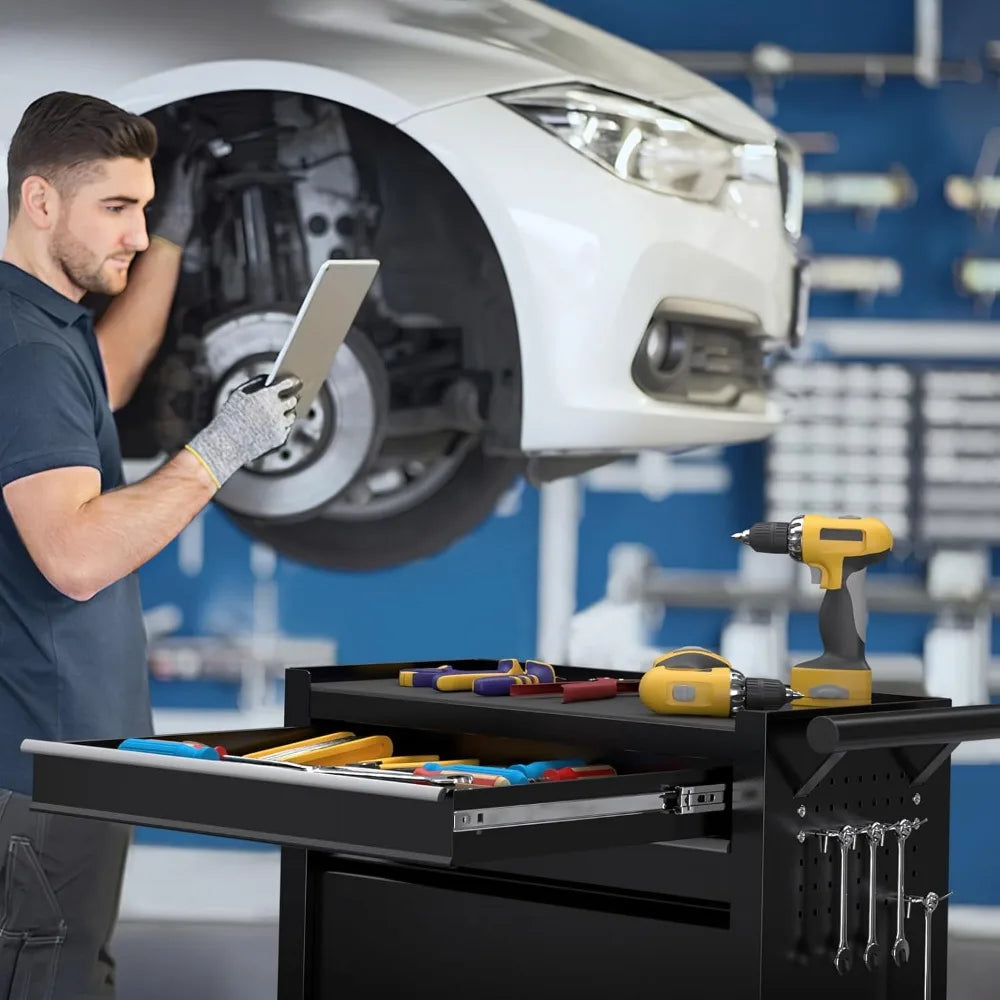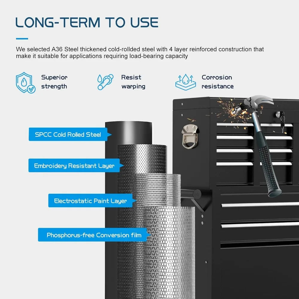- Eight spacious drawers plus a large bottom cabinet keep tools, hardware, and gear organized and within easy reach, so you can grab what you need without scrambling.