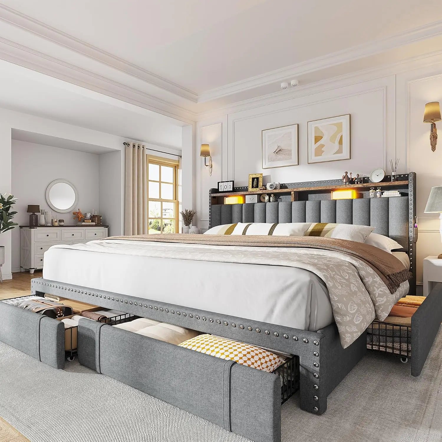 Transform your bedroom into a calm, organized sanctuary with this upholstered king bed frame featuring built-in storage.