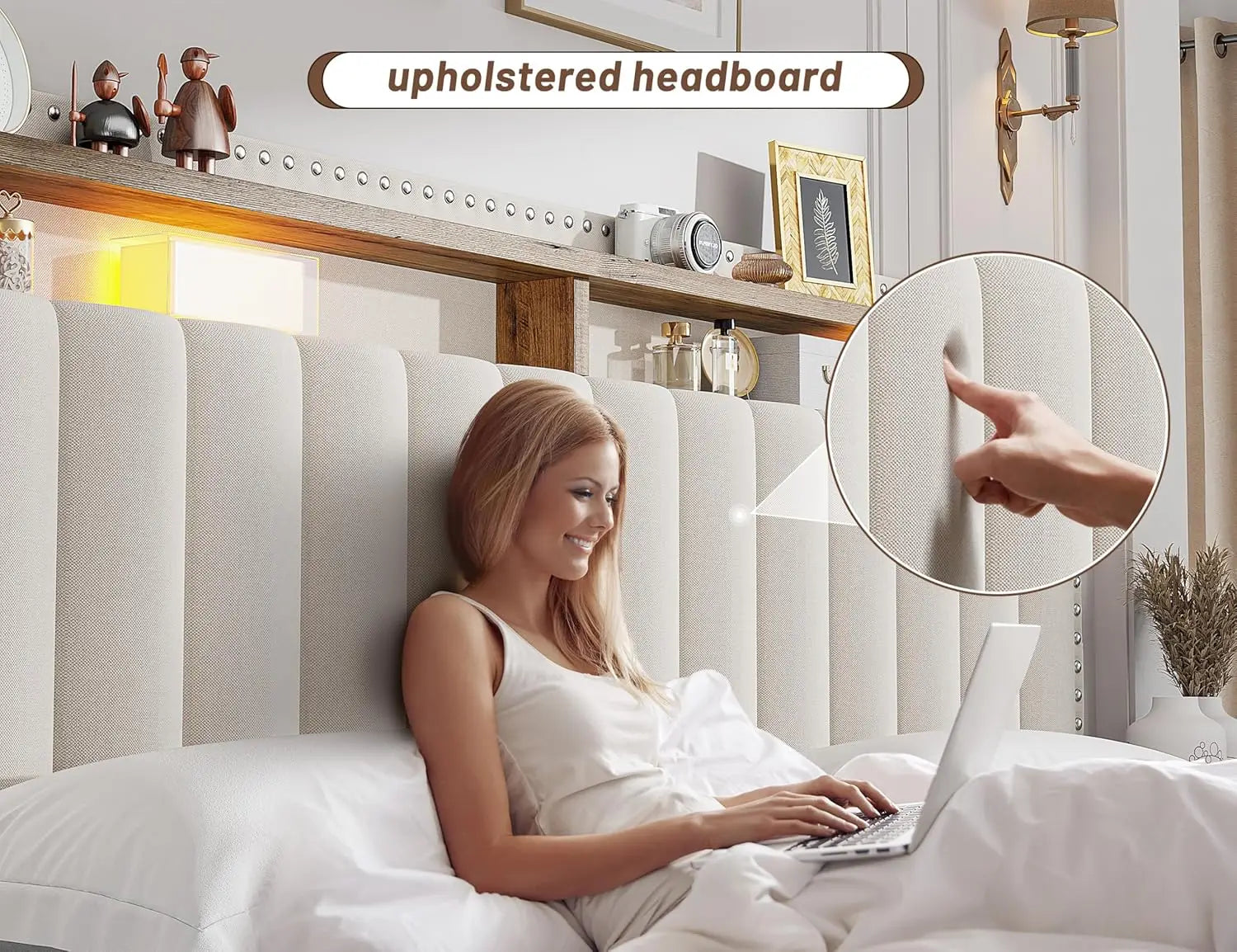 - King-size bed with a 2-tier headboard shelf lets you reach your alarm clock, phone, glasses, or headphones from bed for quick, clutter-free routines.