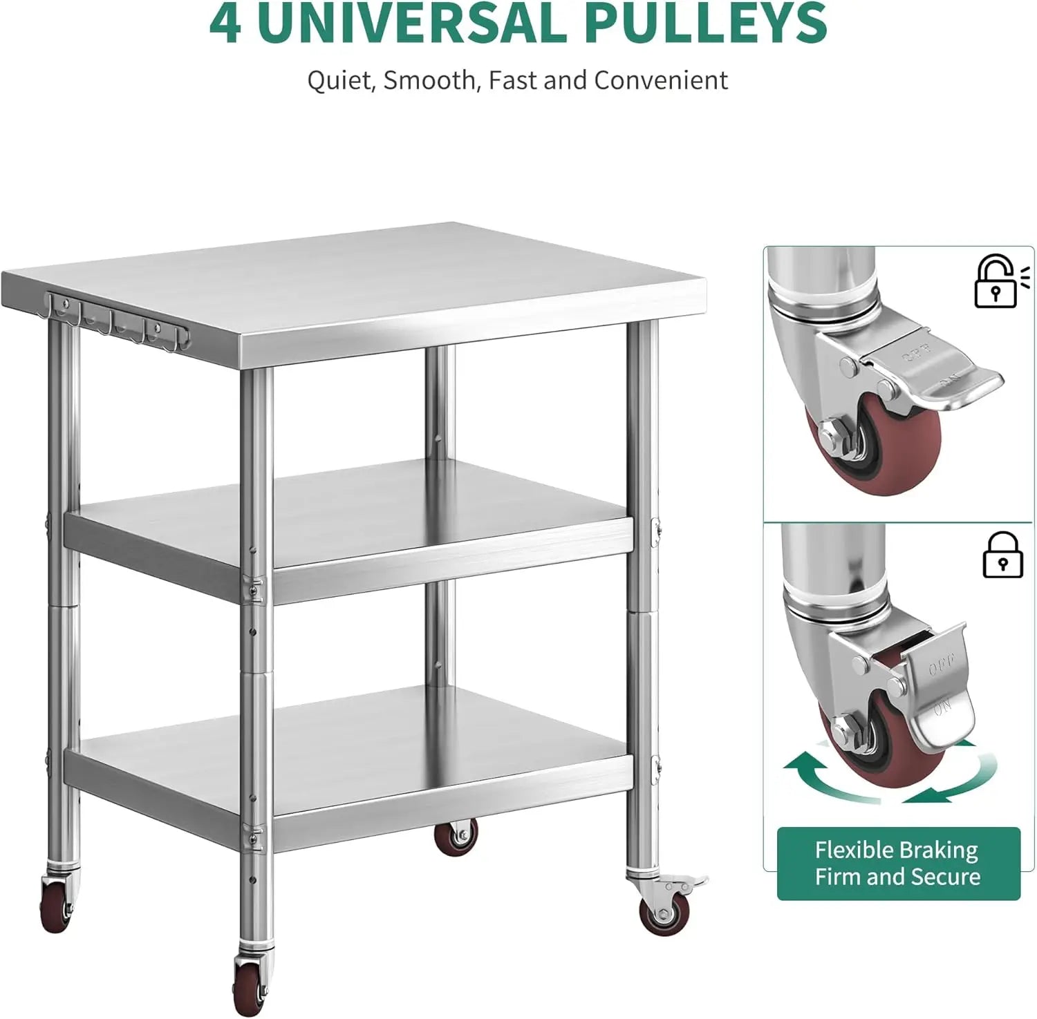 - Mobility and stability: 360-degree rotating wheels let you relocate quietly, while lockable casters keep the table secure during prep, service, or cleaning.